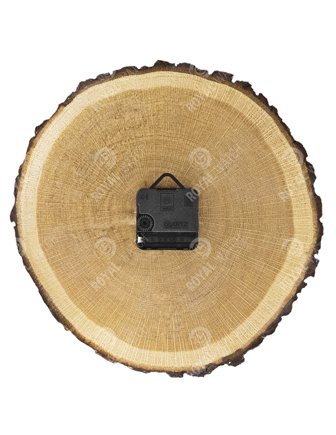Die Uhr besteht aus Eichenquerschnitt mit einem Durchmesser von 30cm (Abweichung 25% der Größe) und einer Dicke von 1cm. Da die Uhr aus einem rein natürlichen Material besteht, ist es möglich, dass die Uhr am Umfang Risse oder heruntergefallene Rinde aufweist (max. 30%).