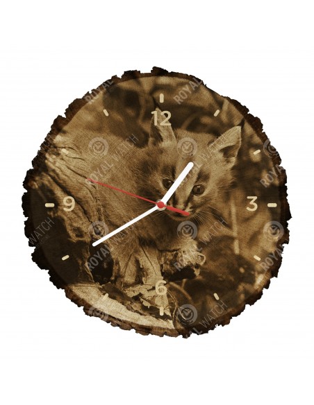 Die Uhr besteht aus Eichenquerschnitt mit einem Durchmesser von 30cm (Abweichung 25% der Größe) und einer Dicke von 1cm. Da die Uhr aus einem rein natürlichen Material besteht, ist es möglich, dass die Uhr am Umfang Risse oder heruntergefallene Rinde aufweist (max. 30%).