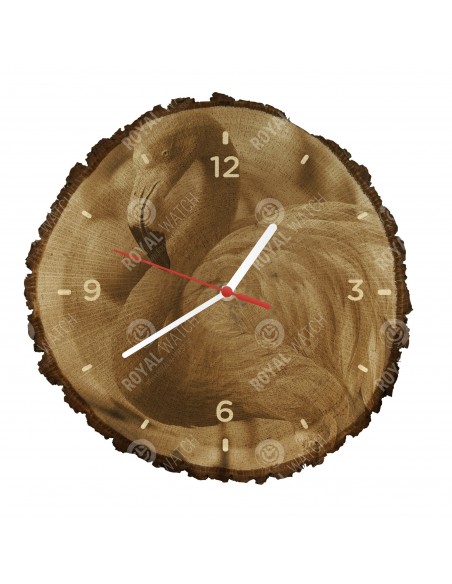 Die Uhr besteht aus Eichenquerschnitt mit einem Durchmesser von 30cm (Abweichung 25% der Größe) und einer Dicke von 1cm. Da die Uhr aus einem rein natürlichen Material besteht, ist es möglich, dass die Uhr am Umfang Risse oder heruntergefallene Rinde aufweist (max. 30%).
