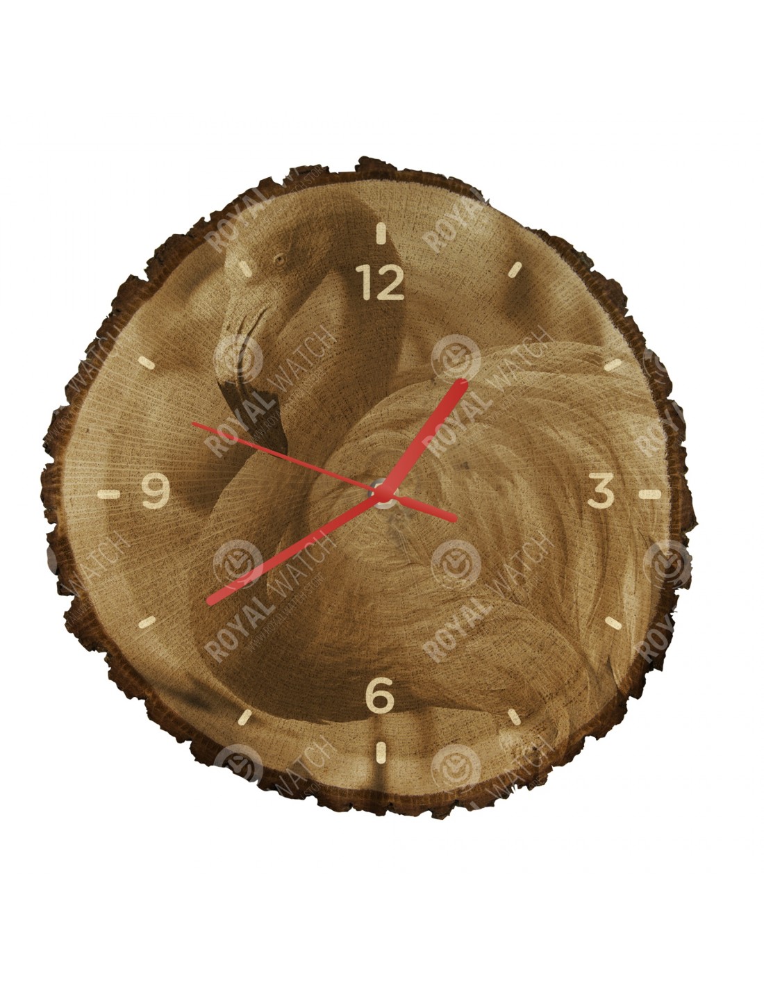 Die Uhr besteht aus Eichenquerschnitt mit einem Durchmesser von 30cm (Abweichung 25% der Größe) und einer Dicke von 1cm. Da die Uhr aus einem rein natürlichen Material besteht, ist es möglich, dass die Uhr am Umfang Risse oder heruntergefallene Rinde aufweist (max. 30%).