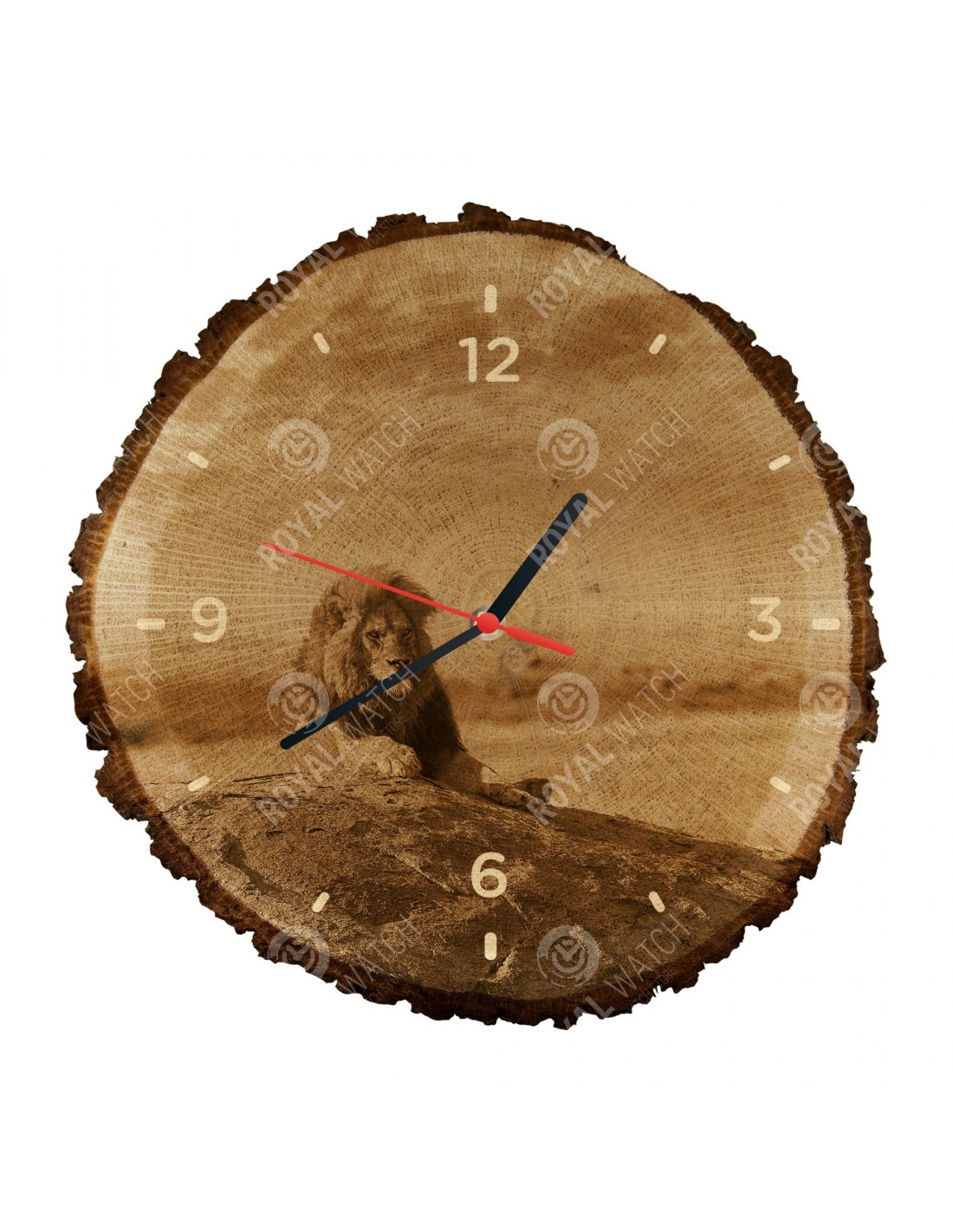 Die Uhr besteht aus Eichenquerschnitt mit einem Durchmesser von 30cm (Abweichung 25% der Größe) und einer Dicke von 1cm. Da die Uhr aus einem rein natürlichen Material besteht, ist es möglich, dass die Uhr am Umfang Risse oder heruntergefallene Rinde aufweist (max. 30%).