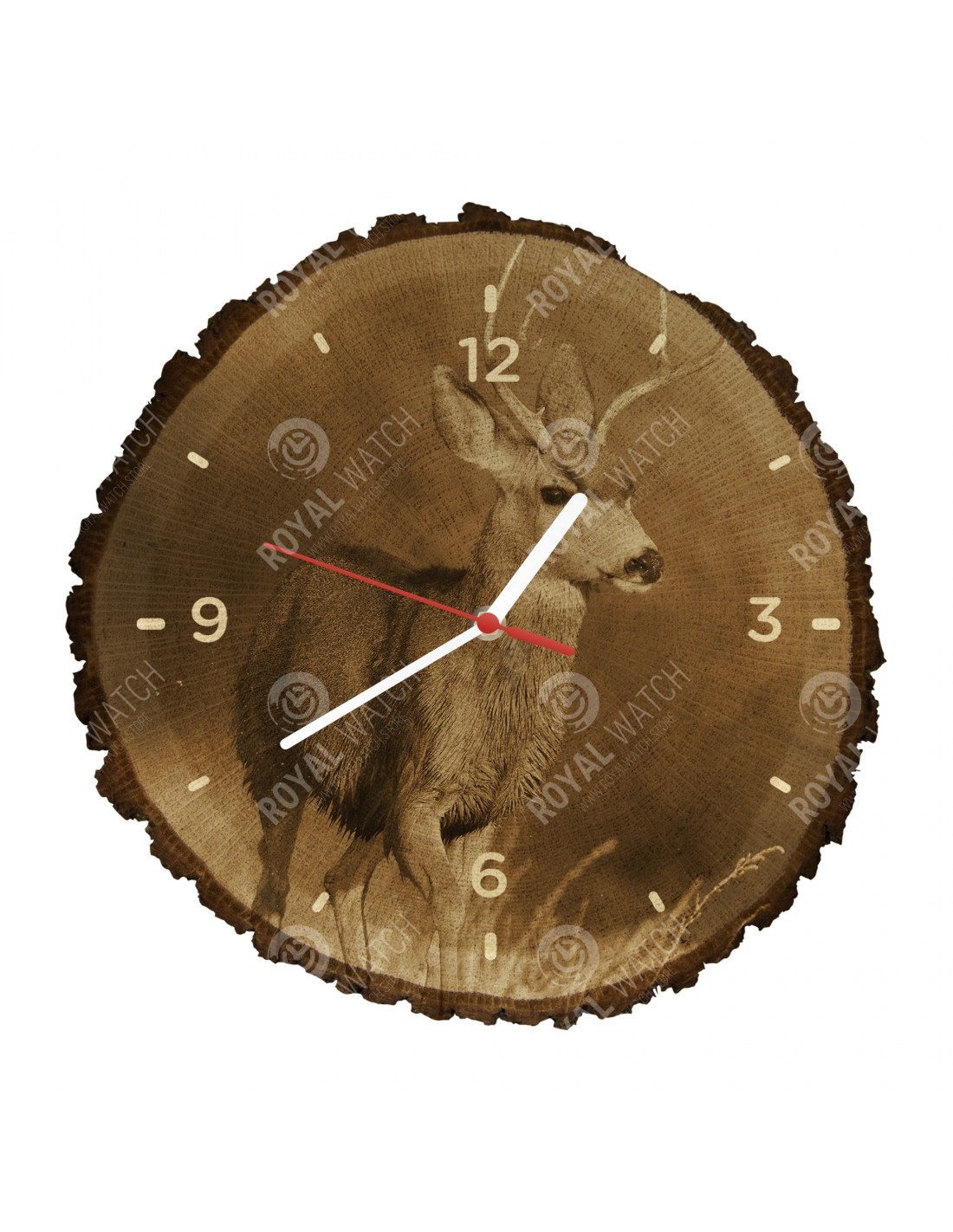 Die Uhr besteht aus Eichenquerschnitt mit einem Durchmesser von 30cm (Abweichung 25% der Größe) und einer Dicke von 1cm. Da die Uhr aus einem rein natürlichen Material besteht, ist es möglich, dass die Uhr am Umfang Risse oder heruntergefallene Rinde aufweist (max. 30%).