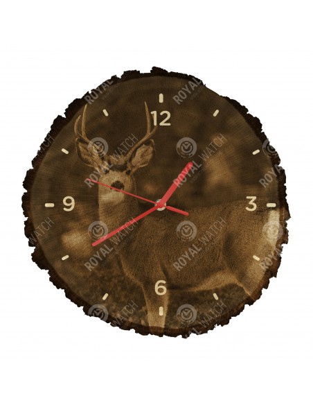 Die Uhr besteht aus Eichenquerschnitt mit einem Durchmesser von 30cm (Abweichung 25% der Größe) und einer Dicke von 1cm. Da die Uhr aus einem rein natürlichen Material besteht, ist es möglich, dass die Uhr am Umfang Risse oder heruntergefallene Rinde aufweist (max. 30%).
