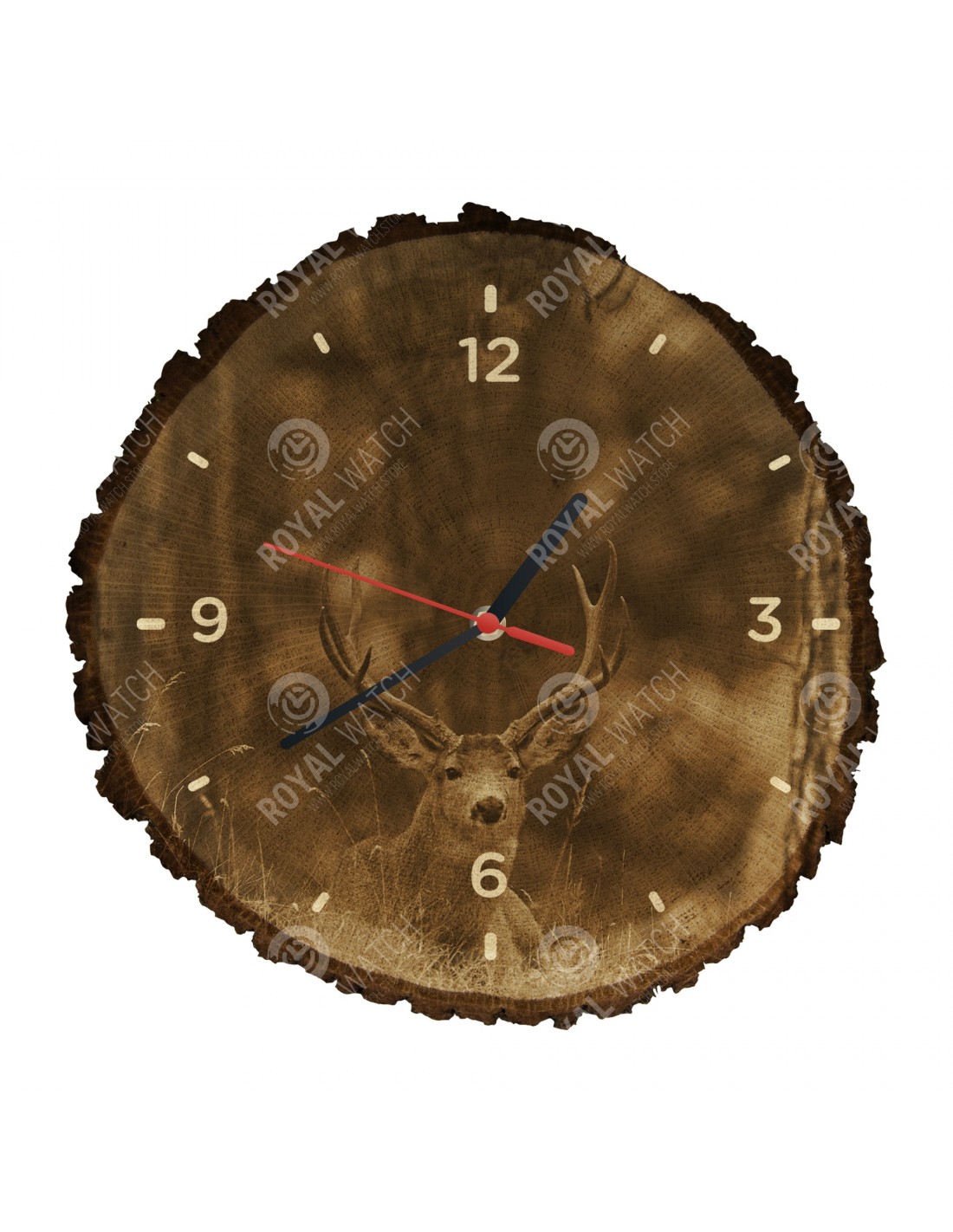 Die Uhr besteht aus Eichenquerschnitt mit einem Durchmesser von 30cm (Abweichung 25% der Größe) und einer Dicke von 1cm. Da die Uhr aus einem rein natürlichen Material besteht, ist es möglich, dass die Uhr am Umfang Risse oder heruntergefallene Rinde aufweist (max. 30%).