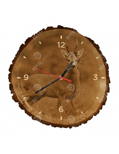 Die Uhr besteht aus Eichenquerschnitt mit einem Durchmesser von 30cm (Abweichung 25% der Größe) und einer Dicke von 1cm. Da die Uhr aus einem rein natürlichen Material besteht, ist es möglich, dass die Uhr am Umfang Risse oder heruntergefallene Rinde aufweist (max. 30%).