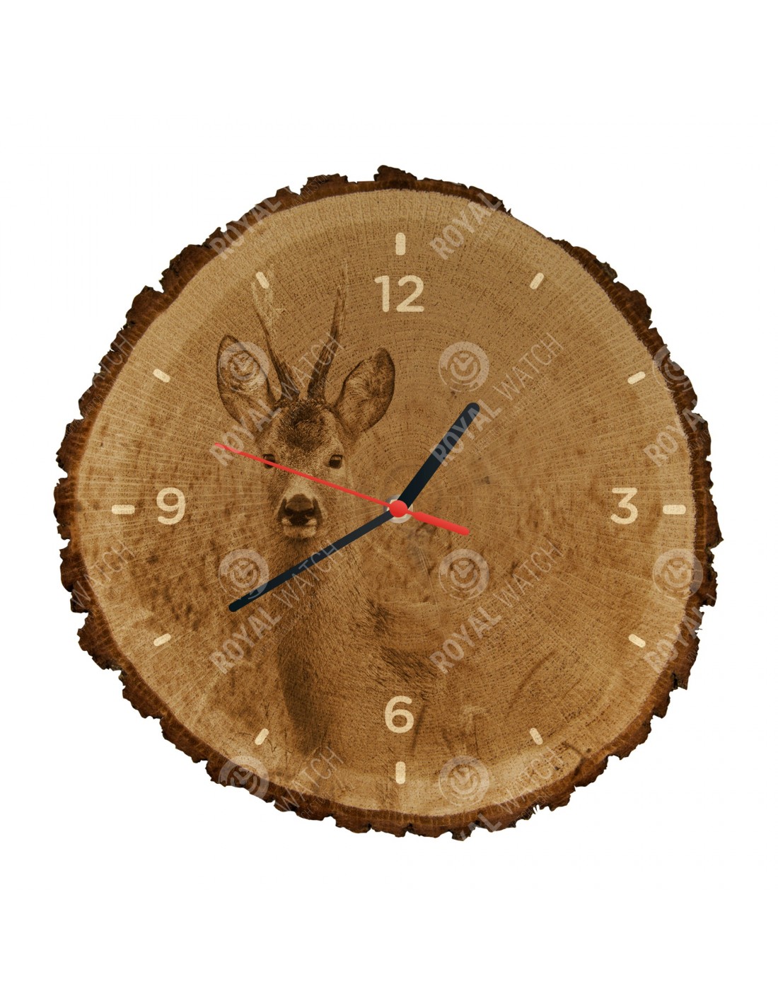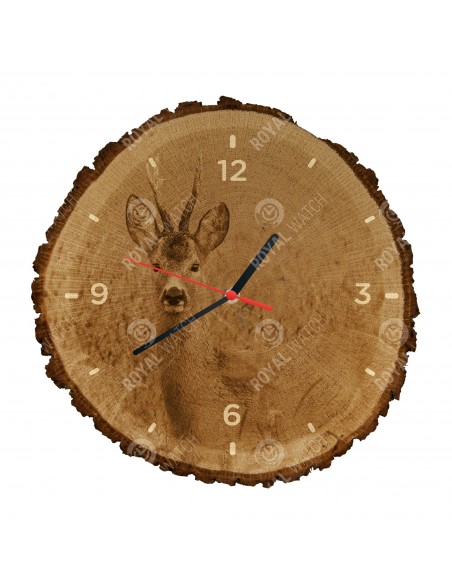 Die Uhr besteht aus Eichenquerschnitt mit einem Durchmesser von 30cm (Abweichung 25% der Größe) und einer Dicke von 1cm. Da die Uhr aus einem rein natürlichen Material besteht, ist es möglich, dass die Uhr am Umfang Risse oder heruntergefallene Rinde aufweist (max. 30%).