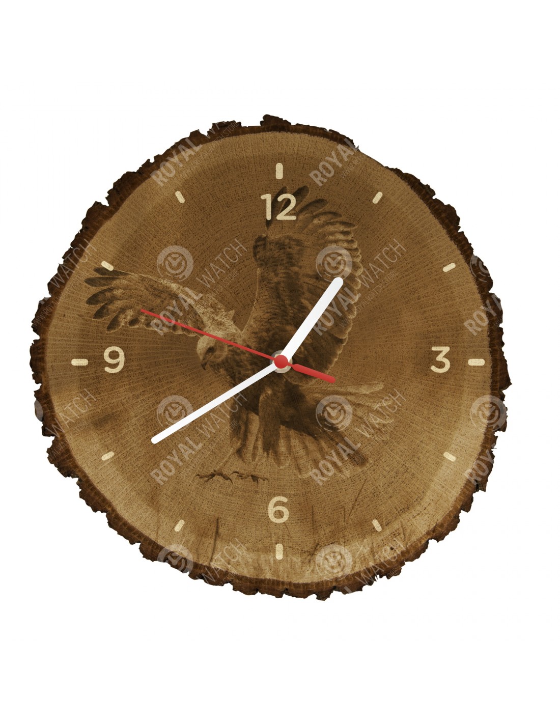 Die Uhr besteht aus Eichenquerschnitt mit einem Durchmesser von 30cm (Abweichung 25% der Größe) und einer Dicke von 1 cm. Da die Uhr aus einem rein natürlichen Material besteht, ist es möglich, dass die Uhr am Umfang Risse oder heruntergefallene Rinde aufweist (max. 30%).