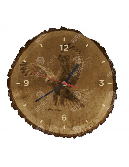 Die Uhr besteht aus Eichenquerschnitt mit einem Durchmesser von 30cm (Abweichung 25% der Größe) und einer Dicke von 1 cm. Da die Uhr aus einem rein natürlichen Material besteht, ist es möglich, dass die Uhr am Umfang Risse oder heruntergefallene Rinde aufweist (max. 30%).