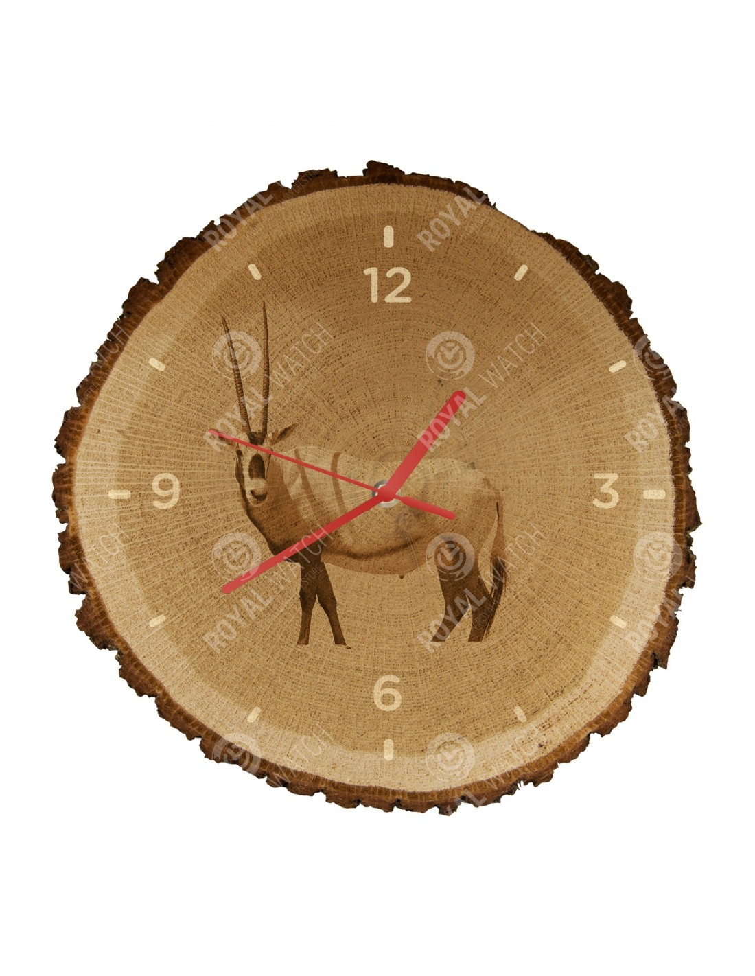 The clock is made of oak cross-section with a diameter of 30cm (deviation of 25% size) and with a thickness of 1cm. Because the clock is made of a purely natural material, it is possible that there are cracks or fallen bark on the clock's circumference (max. to 30%).