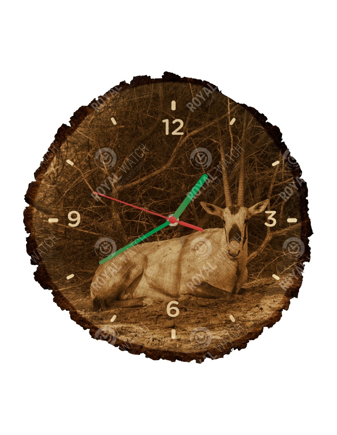 The clock is made of oak cross-section with a diameter of 30cm (deviation of 25% size) and with a thickness of 1cm. Because the clock is made of a purely natural material, it is possible that there are cracks or fallen bark on the clock's circumference (max. to 30%).