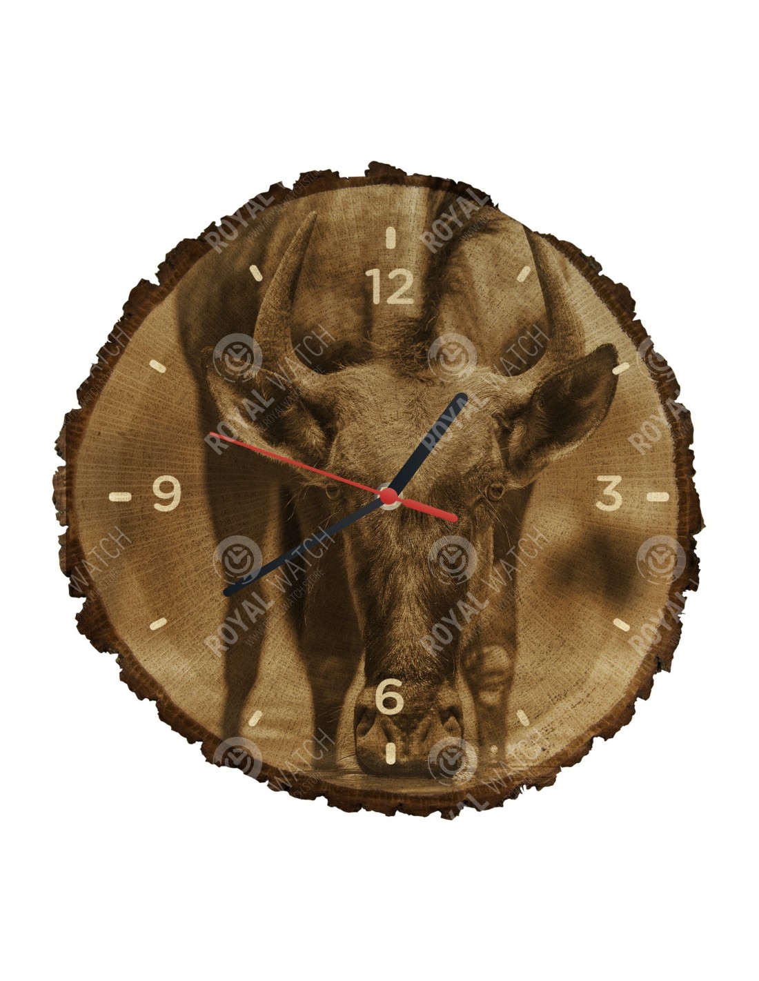 The clock is made of oak cross-section with a diameter of 30cm (deviation of 25% size) and with a thickness of 1cm. Because the clock is made of a purely natural material, it is possible that there are cracks or fallen bark on the clock's circumference (max. to 30%).