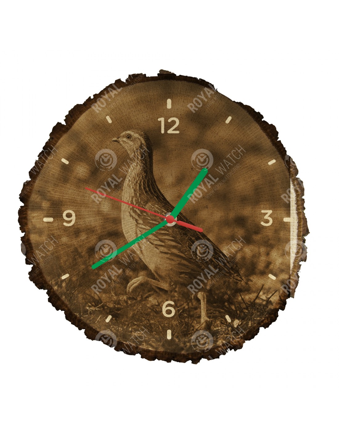 The clock is made of oak cross-section with a diameter of 30cm (deviation of 25% size) and with a thickness of 1cm. Because the clock is made of a purely natural material, it is possible that there are cracks or fallen bark on the clock's circumference (max. to 30%).