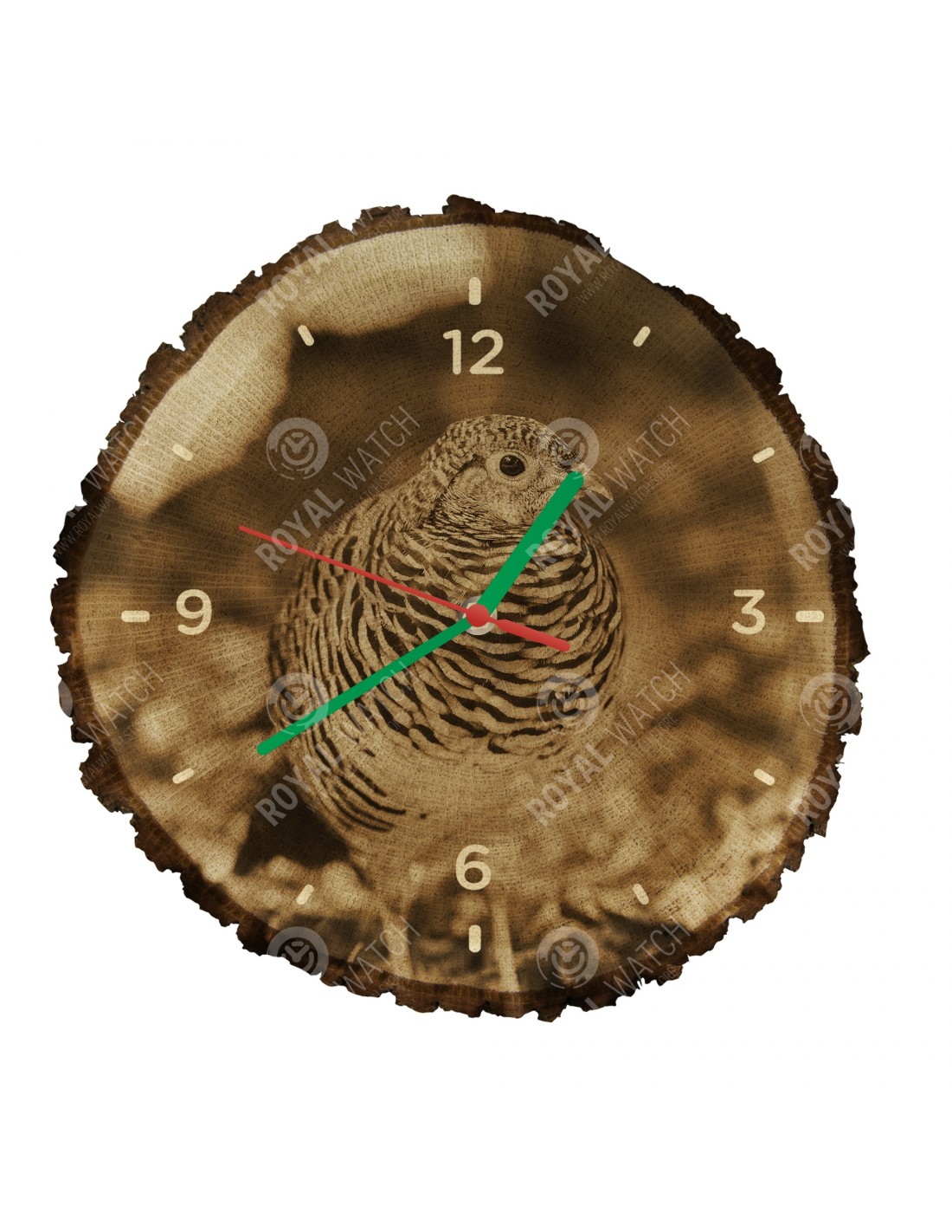 The clock is made of oak cross-section with a diameter of 30cm (deviation of 25% size) and with a thickness of 1cm. Because the clock is made of a purely natural material, it is possible that there are cracks or fallen bark on the clock's circumference (max. to 30%).