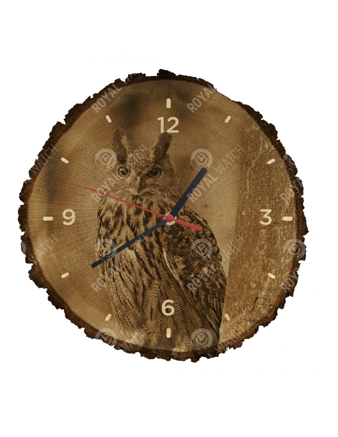The clock is made of oak cross-section with a diameter of 30cm (deviation of 25% size) and with a thickness of 1cm. Because the clock is made of a purely natural material, it is possible that there are cracks or fallen bark on the clock's circumference (max. to 30%).