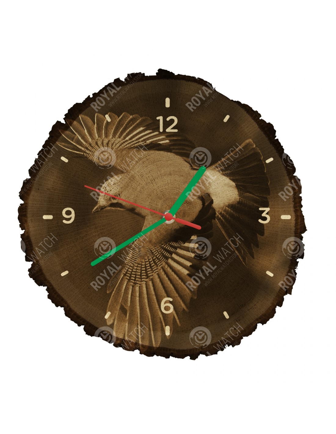 The clock is made of oak cross-section with a diameter of 30cm (deviation of 25% size) and with a thickness of 1cm. Because the clock is made of a purely natural material, it is possible that there are cracks or fallen bark on the clock's circumference (max. to 30%).