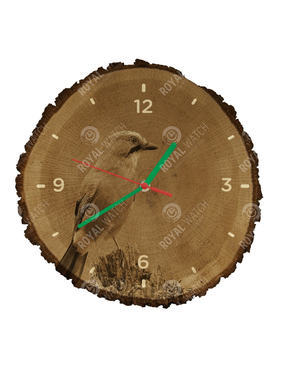 The clock is made of oak cross-section with a diameter of 30cm (deviation of 25% size) and with a thickness of 1cm. Because the clock is made of a purely natural material, it is possible that there are cracks or fallen bark on the clock's circumference (max. to 30%).