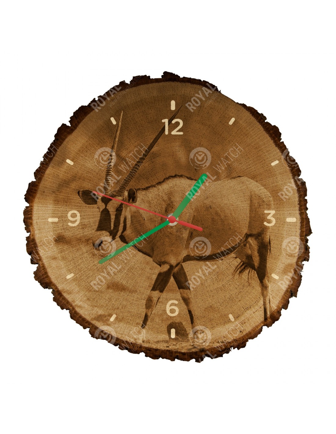 The clock is made of oak cross-section with a diameter of 30cm (deviation of 25% size) and with a thickness of 1cm. Because the clock is made of a purely natural material, it is possible that there are cracks or fallen bark on the clock's circumference (max. to 30%).