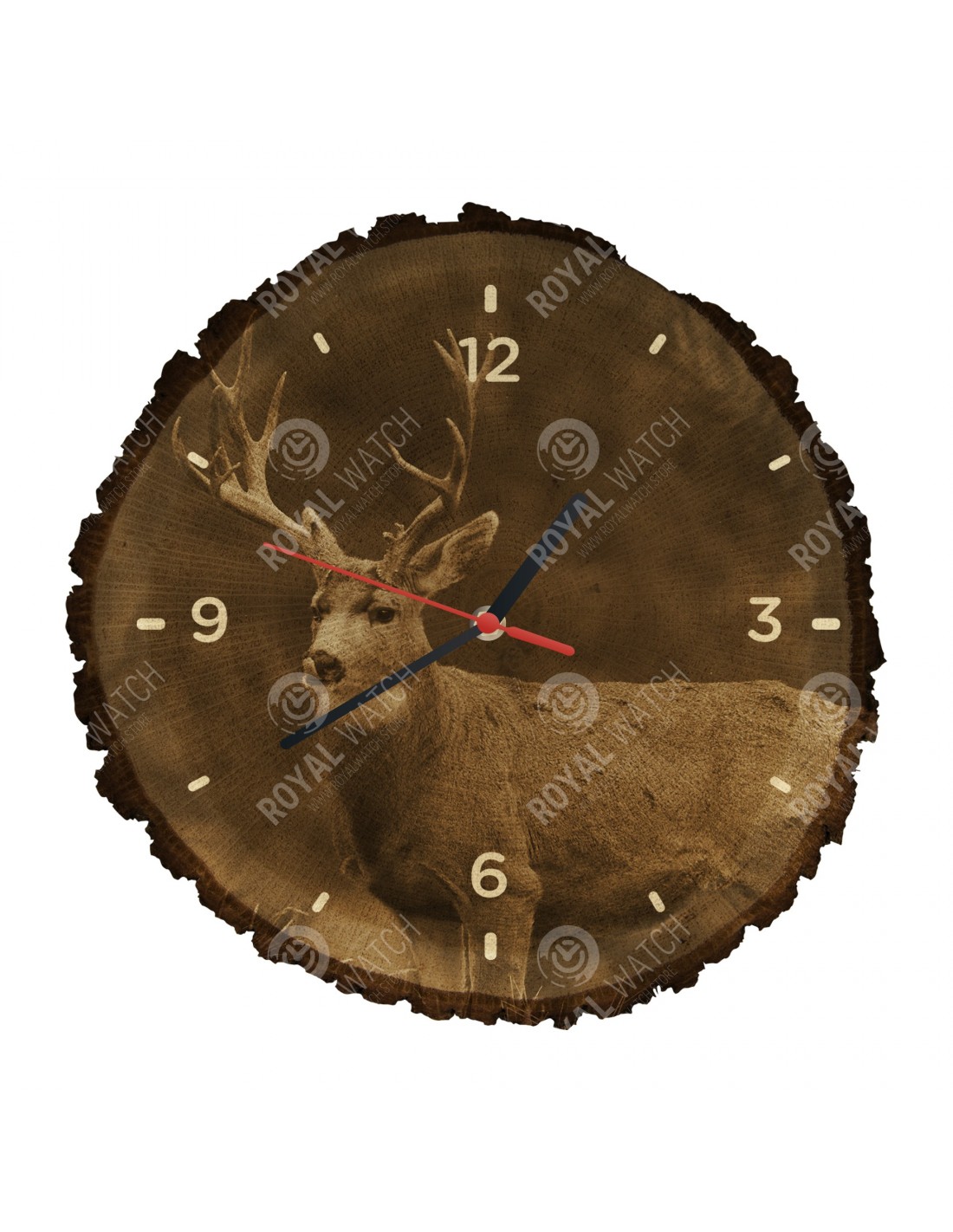 The clock is made of oak cross-section with a diameter of 30cm (deviation of 25% size) and with a thickness of 1cm. Because the clock is made of a purely natural material, it is possible that there are cracks or fallen bark on the clock's circumference (max. to 30%).